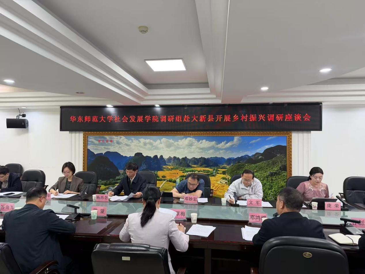 华东师范大学庞荣首先介绍了调研组来意及学校、学院、中心的基本情况;大新县委副书记、县长陈蒙详细介绍了大新县近年来在巩固拓展脱贫攻坚成果、全面推进乡村振兴方面的工作情况、主要成效及面临的挑战。自治区党委社会工作部二级巡视员杨再念从社会工作角度,对加强边境地区基层治理、提升服务能力提出了建议;自治区农业农村厅党组成员、自治区乡村振兴外资项目发展中心主任邓妙宏同志讲话,他充分肯定了此次调研的意义,并介绍了自治区在支持边境地区乡村振兴、外资项目发展方面的政策举措,期待与华东师范大学等高校智库加强合作。华东师范大学文军作总结讲话。他代表调研组对大新县的精心安排和各级部门的积极参与表示感谢,并结合实地调研情况,对后续开展校地合作提出了建议,表示学院将依托人工智能与城乡融合发展研究中心平台,充分发挥社会学、民俗学、人工智能等多学科优势,聚焦边境地区发展的重大理论和现实问题,进一步加强与地方的合作,共建边境乡村振兴示范区,为服务国家乡村全面振兴战略贡献智慧和力量。