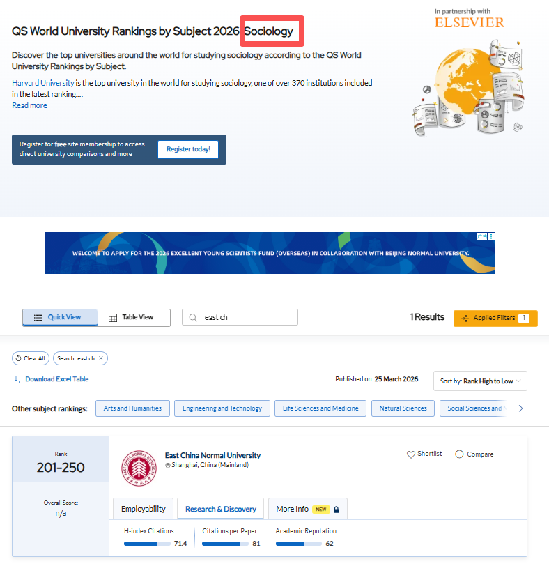 近日,备受瞩目的2026年度QS世界大学学科排名公布,我校社会学学科与北京大学、清华大学、中国人民大学等院校一同入围,位列全球201-250名的位次。在中国大陆上榜高校排名中较去年排名提高了一位,位列第10名。这是我校继2024年以来连续三年上榜,展现出我校社会学学科在全国社会学研究领域不断进步的发展态势。